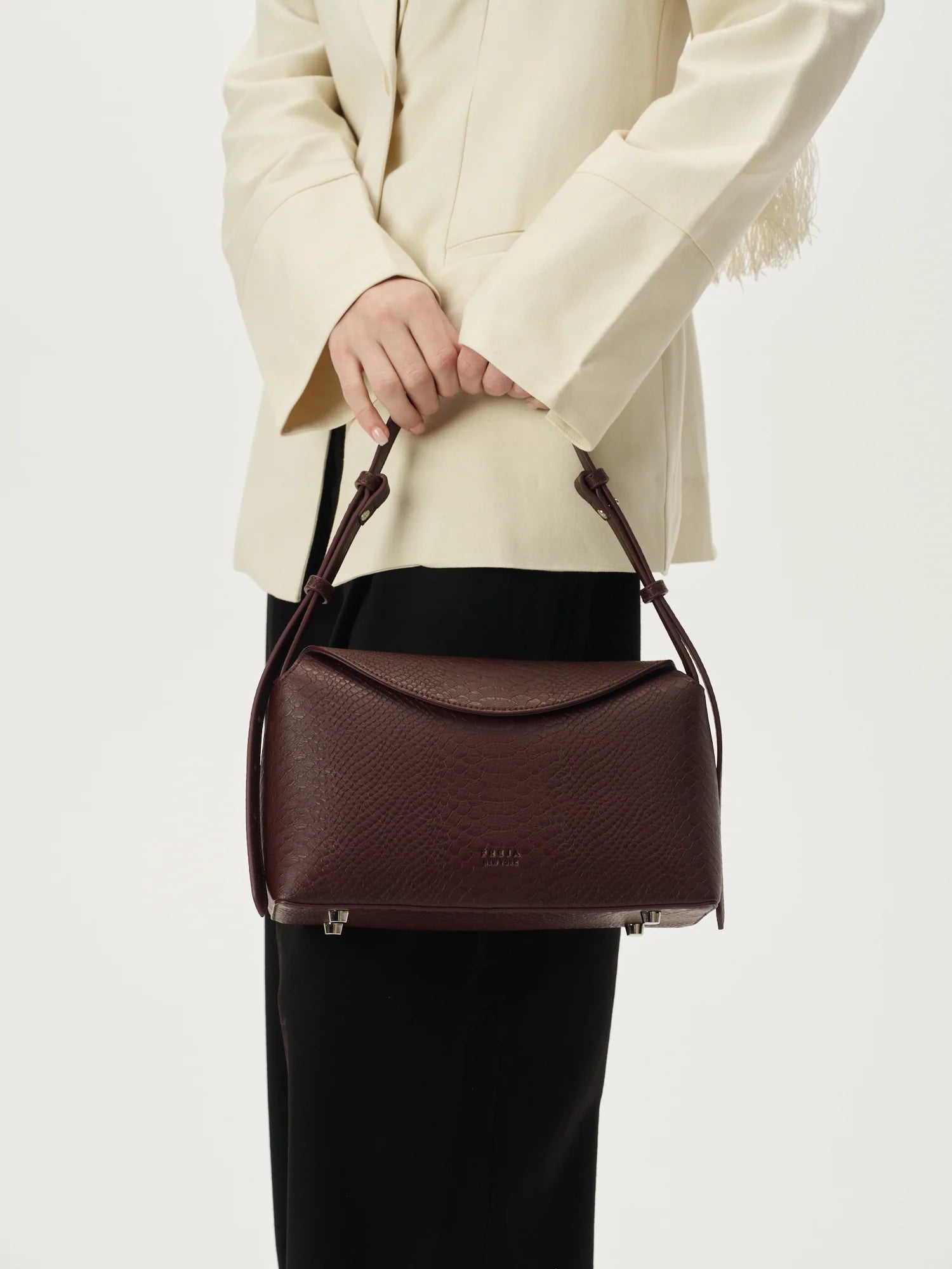 Our bags are handmade from custom-developed pebbled vegan ultrafiber leather, and lined with our signaturevegan merlot ultrafiber.